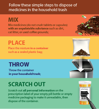 Household Disposal If you can’t find a convenient take-back program, you can throw medicines out with your household trash. Safe home disposal protects the environment. It also protects the community, keeping substances out of the hands of those who may abuse them. How to dispose of unused medications at home: Use a drug disposal pouch.